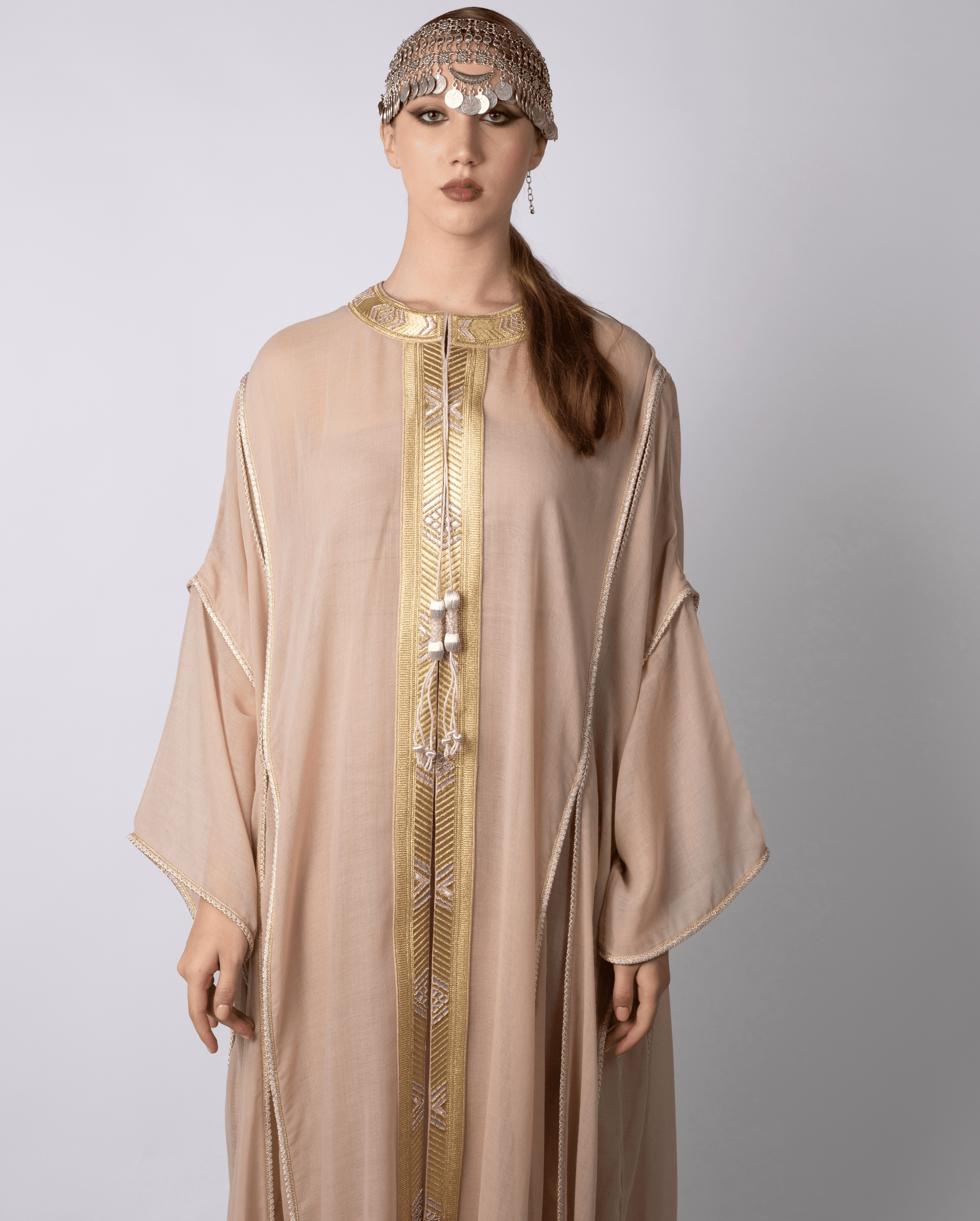 The seams along the front are adorned with intricate embroidery,